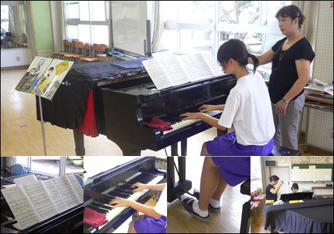 音楽室をのぞくと、合唱コンクールの伴奏の練習をしていました。この夏休みを使って、指揮者や伴奏者の人は練習を重ねています。自分の多くの時間をさいて練習してくれているのですね。生徒の多くのみなさんがクラスで練習するときには、その練習を経てからなので、指揮や伴奏がある程度できるようになっていて、それまでの苦労には気づけないかもしれませんね。でもその裏にはこんな努力があることを、みなさんも知っておいてください。そのみなさんの思いが指揮者や伴奏者に伝わり、よりよい合唱を創りあげることにつながると思います。指揮者、伴奏者のみなさん、がんばってください。