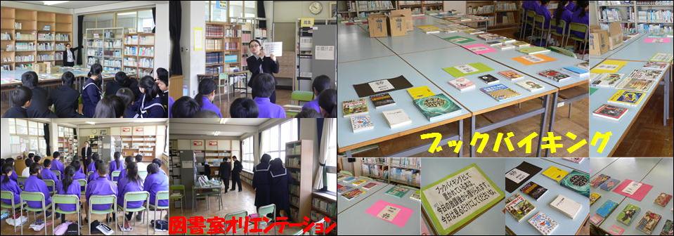 昨日,1年生で国語の時間を使って図書室のオリエンテーションがありました。中学校では,木曜日に司書の石川さんにいつも来ていただき,図書室のお世話をしてもらっています。そこで,今回は1年生を対象に図書室の利用についてお話してもらいました。図書室の本が10に分類されていることやそれぞれの場所にどんな本が置かれているのか,図書室でのマナーなど・・・。また,文化委員さんに本の借り方について確認してもらっていました。お昼休みと放課後に借りられ,期間は1週間,2冊までということでした。説明の後,自由に本を見たり,借りたりしていました。 写真は“ブックバイキング”といって,食事のバイキングのように机に並べられたいろいろな種類の本を自由に見ていくというものだそうです。ブックバイキングに並べられていた本は今日から貸し出ししてもらえるそうです。