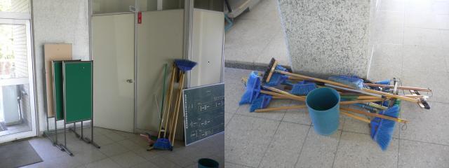 今日は清掃の時間に各掃除場所の清掃用具の点検をしました。環境委員さんを中心に清掃用具の管理をしてもらっています。年度が変わり、清掃場所の割当も変わったので、今年の割当に合うように清掃用具を入れ替え、壊れていたり、不具合があるものは交換してもらいます。今日は1階の職員玄関奥にある清掃用具庫前に用具が集められていました。洗剤などの補充や毎週木曜日のゴミ回収もこの場所ですから、特に1年生のみなさんは場所を覚えておいてくださいね。 環境委員さんは他に、毎日学校にあるフラワーポットの花などへの水やりもしてくれています。目立たないところで、しっかり活躍してくれているのですね。そのおかげでお花も元気にしています。環境委員さん、いつもご苦労さま。 |