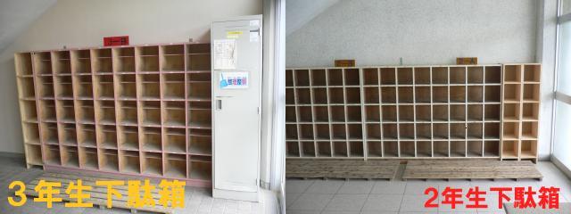 3月18日付けのHPでもお知らせしたように、生徒数の増加にともない、下駄箱を新たに作りました。それも先生による手作りで。クラブに来ている人はもう気づいているかもしれませんが、写真のように、2,3年生の昇降口のところに設置しました。まだ知らない人は今度学校に来たときに、ぜひ見てください。玄関に入ると、まだ新しい木の匂いがしますよ。