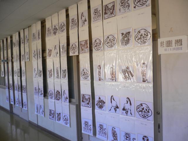 理科室前の廊下には、1年生の自然教室で作成した「伊勢型紙」の作品が展示されています。自然教室のときにできなかった生徒は学校へ戻って来てから放課後残って作品を仕上げていました。もし来校されることがありましたら、ぜひご覧ください。