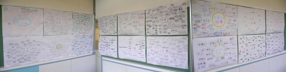 写真は1年生教室前の廊下に掲示されている「仕事」をテーマにした”マッピング”といわれるものです。1年生では、2年生で行う「職場体験学習」に向け取組が始まっています。班に分かれて思いつく仕事やそれにつながる事柄などを模造紙いっぱいにどんどん書きつづりました。自分の生活を”仕事”という視点で振り返り、社会の中には本当にさまざまな仕事があることに気づけたことと思います。