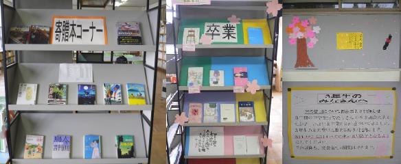 先日、まきの木台の片岡さんから、15冊の本を寄贈していただきました。図書室に「寄贈本」のコーナーをつくり寄贈していただいた本を陳列してあります。もう何冊かは貸し出されていました。片岡さん、ご寄贈ありがとうございました。有効に活用させていただきます。 他に「卒業コーナー」がつくられていました。3年生は3月8日が卒業式ですので、あと1ヶ月で卒業ですね。卒業というと”お別れ”であったり、”巣立ち”であったり、後輩への”受け継ぎ”であったり、・・・。いろんなことが思い浮かんできます。いろんな”卒業”にまつわる本が並べられていました。また手にとって読んでみてください。 廊下へ出ると、図書委員会作成の卒業生に向けた掲示物が掲示されていました。 3年生の本の貸出返却は、いろいろとパソコンの手続きもあり、2/14までと、もうすぐですので、本を借りている人は忘れず、それまでに返却してください。 |
