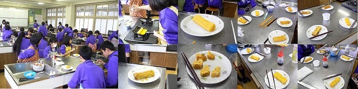20日(木)は2年C組でした。この日がのぞくのが遅れ、ほとんどの人が焼き終えていました。中には焼けた玉子を切ってある班もあり(実は切ってはいけなかったようですが…)、きれいに並べてありました。色もいろいろでC組は醤油入りが多くありました。醤油が入ると少し茶色かかっています。溶き方をおさえると、白身の部分が少し見えていたり、焼き加減で少し焦がしてみたりと人それぞれの玉子焼きが出来上がっていました。