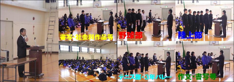 今日の3限目にはこれまでの表彰伝達と2学期終業式がありました。新人戦等の部活動の表彰、書写や作文、詩、社会科作品等の表彰などがとてもたくさんありました。校長先生からは、表彰にあたり、自分自身のがんばりを称えるとともに、自分を支えてくれた人の存在を感じ感謝の気持ちを忘れないでとの話がありました。 その後2学期の終業式が続けてありました。校長先生から、2学期の生活を振り返り、今後新たな目標をもって生活していくことが大切であると話されました。井上先生からは冬休みの生活についての話がありました。特に交通事故が多発していることから、自分の身は自分で守ることの重要性が話されました。 3学期のスタートは1月8日(火)です。生徒のみなさんは、それまで健康に気をつけて、有意義な冬休みを過ごせるとよいですね。 保護者や地域の皆さま、今年度も保々中の教育活動にご協力、ご支援、ありがとうございました。新年からもよろしくお願いします。 |