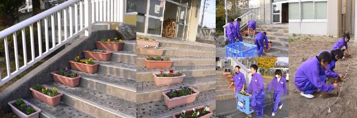 今日の放課後、環境委員会で四日市市商工会議所等からいただいたパンジーとチューリップの球根を植えてもらいました。パンジーは2年生の昇降口・職員玄関前と1,3年生の昇降口前の階段にフラワーポットに植えて置いてもらいました。チューリップは保健室前の花壇に球根を植えてもらいました。チューリップは芽が出るまでにはまだ時間がかかりそうですが、パンジーはすぐに楽しめます。色の配置も考えて置いてもらっていました。登下校時にはパンジーが見られます。花は心を和ませてくれますね。環境委員のみなさん、ありがとうございました。 |