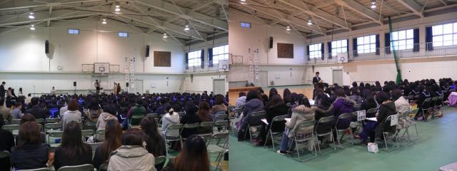 人権講演会では玉城ちはるさんの講演に先立って、ギターとハープの2人組グループ「さらさ」(森川敏行さん、Machikoさん)の演奏からスタートしました。TV番組「情熱大陸」のテーマ曲の演奏でした。ギターとハープの生演奏に圧倒されました。玉城さんのお話では、10年ほど前からされている中国や韓国の留学生などのホストマザーの経験や東日本大震災でのボランティア活動などを通して感じたことや考えたことなどを話されました。文化の違いや考え方の違いで誤解が生じ、無視したり、相手の考え方を否定したりして付き合うのでなくて、お互いにきちんと気持ちを伝え合う(相手のこんなところが嫌い、でもこんなところが“大好き”)ことが大切であること、また生きることは苦しい、だけど楽しいこともある。大人も子どもも誰でも悩みを持って生きているし、間違うこともある。そんな間違いを受け入れられるようになったら、間違ってしまう自分自身も許して生きられるようになる。葛藤すること(悩んだり、迷ったりすること)はとても大切なことなんだと話されました。話の間に歌が入り、玉城さんの透き通った歌声を聴きながら、話されたことを自分を振り返って考えることができたように思います。 |