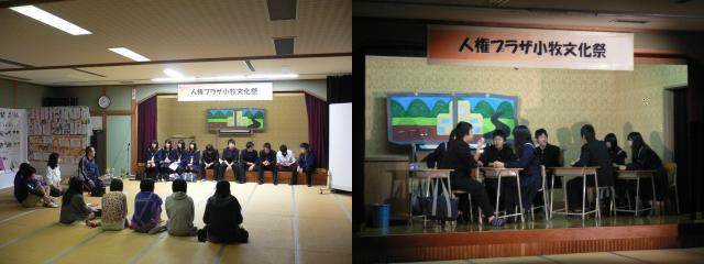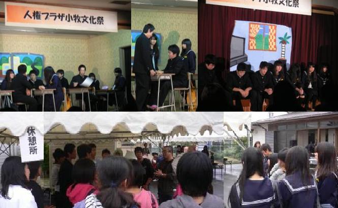今日は小雨が降る中、人権プラザ小牧の文化祭がありました。午前の部の舞台発表では、最初に乳幼児を育てる会から「伝えよう!つながろう!友達の輪!!」と題して活動紹介、自己紹介、歌の発表がありました。次に小学校の低学年、中学年、高学年とそれぞれ、「たんけん はっけん わたしたちのまち」「みんなにやさしい町『保々』」「わたしたちの気づき」と題して活動や劇での発表がありました。最後に中学生から「きっと変わっていけるから 〜逃げる自分と向き合う自分〜」の人権劇を発表しました。たくさんの観客を前に立派に劇を発表できました。出演者、スタッフのみなさん、お疲れさまでした。今度は保々中学校の文化祭での発表もありますので、またがんばってください。 今日見られなかった方は、ぜひ文化祭のときにご覧ください。 |