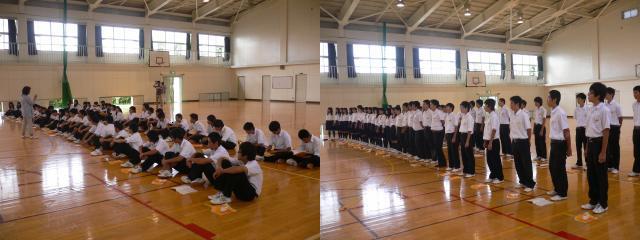 体育祭が終わってまだその余韻が残る学校ですが、11月2日の文化祭に向けて合唱の学年練習がもう始まっています。音楽の時間には学年合唱曲や各クラスの課題曲の練習をしてきてはいますが、学年全体での練習はこれからです。昨日は1,2年生が、今日は3年生が体育館に集まり、学年練習をしていました。写真は今日の3年生の様子です。今の時点では未完成ですが、本番での曲の仕上がりに期待しています。生徒のみなさん、がんばってください。