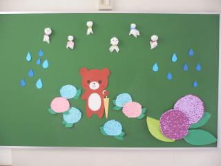 1階のつきあたりの掲示板に写真のような素敵な掲示がされていました。話を聞くと、ここの掲示物は、文化部の人たちが学年で分担して、毎月掲示物をつくってくれているとのことでした。今月は3年生による作品で、テーマは「梅雨」だそうです。 | |