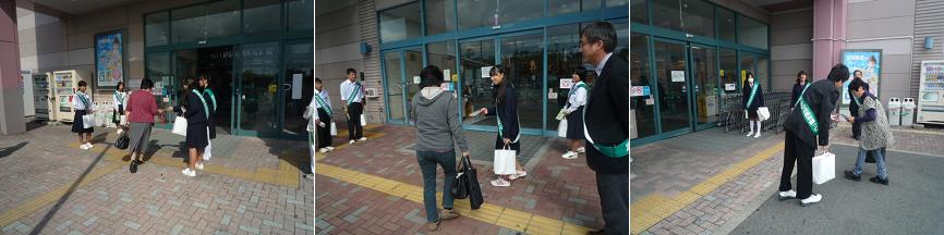 四日市市青少年育成市民会議による子ども若者育成支援の街頭啓発活動に、生徒会役員の生徒を中心に参加しました。お店を訪れる人々に、大きな声で呼びかけていました。