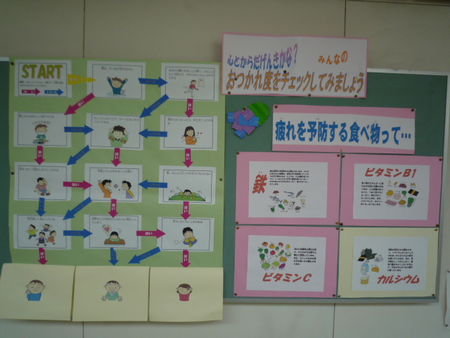 保健室前に「お疲れ度チェックフローチャート」の掲示があります。疲れを予防する栄養素・食べ物も掲示してあるので参考にしてください。