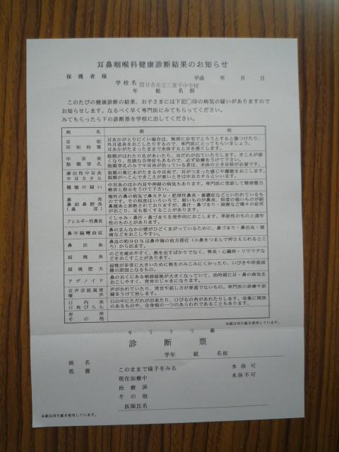 4月28日(火)、3年生の歯科検診が終了しました。 学校歯科医の前川先生に検診をしていただいた後、衛生士さんに歯垢の染め出しをして、歯垢が歯にどのくらい付着しているかを見ていただきました。中には、ピンクに染まった歯を見てとても驚いている人もいました。きれいに見えている歯も、実はまだ汚れが残っているんですね。毎食後5分くらいかけて、一本一本丁寧に磨くことが大切です。正しい歯の磨き方は、保健便りに載せましたのでまた見てくださいね。 詳しく診てもらったほうがいい人には、後日「治療のすすめ」を渡します。お知らせがなかった人は、異常なしの人です。