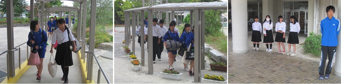5月26日(月)、今日は生活安全委員会の3年生が生徒昇降口のところであいさつ運動をしていました。「おはようございます」、笑顔を見せながらあいさつを交わすと、とてもすがすがしい気持ちになります。明日は2年生、あさっては1年生の順で生活安全委員があいさつ運動を行います。しっかりとお互いにあいさつを交わしましょう。 |