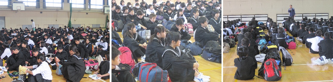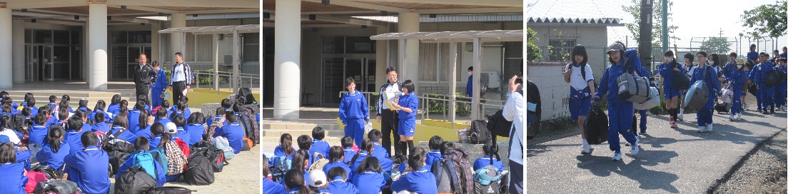 5月6日(火・祝)、1年生は自然教室の事前指導がありました。朝から大きな荷物を持って登校し、1限目から3限目までしおりを使っての説明や荷物点検、集合練習などがありました。校長先生からは「あいさつ」「言葉づかい」「時間を守る」ことの3つを意識するように話がありました。明日からの3日間天気もよさそうです。充実した楽しい自然教室にしてください。 |