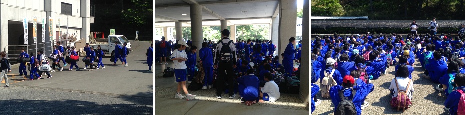 5月7日(水)午前9時頃、1年生は四日市市立少年自然の家に到着しました。体育館下ピロティへ宿泊用バッグを置いた後、広場へ移動し、ふれあい牧場への移動に向けた説明がありました。クラスでそろって写真撮影も行いました。 |