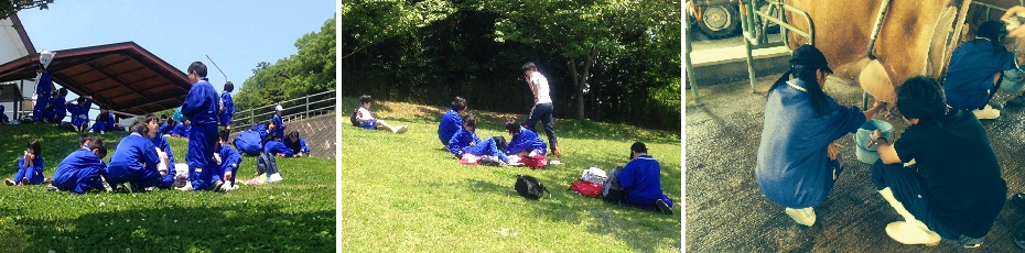 1年生はふれあい牧場へと移動し、10:00頃からバターつくり体験と搾乳体験を行いました。初めての体験で戸惑った人もいたと思います。天気も良く、班員とともに芝生の上で昼食をとったり、遊んだりもしました。とっても気持ちよさそうでした。生アイスクリームもとってもおいしかったです。 |
