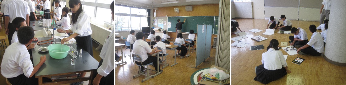 理科室では、気体を集める実験が行われていました。理科は実験があって体感として学習できる分野があるので、とてもおもしろいですね。今日はどんな気体を集めていたのでしょうか。ホールでは社会科の作品を見て、感想の交流をしていました。夏休みを使ってなかなかの超大作になっている人もいましたね。まなび学級では、歯医者での話がされていて、みんな楽しそうに授業者の話を聞いていました。