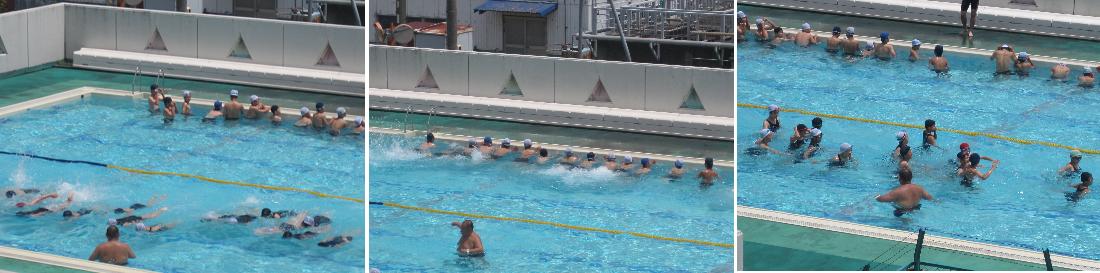 7月1日(月)、保健体育ではプールで水泳の授業が始まりました。1年生の保健体育では、水中を歩いたり、水しぶきを上げて、バタ足の練習をしたりなど、基本的な練習を全員揃ってしていました。これから夏真っ盛りです。暑い夏、水泳の授業も楽しみですね。 |