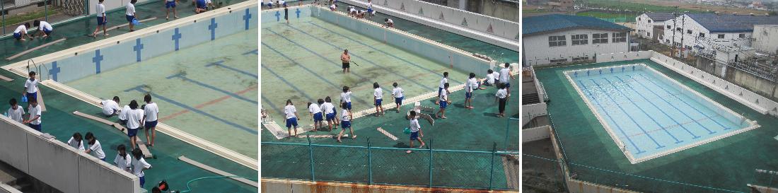 6月18日(火)、体育の時間に今後行う水泳の授業の準備のために、プールそうじをしました。みんなで協力して取り組んでいました。そうじが終わった後のプールはとてもきれいでした。7月から始まる水泳の授業が楽しみですね。 |