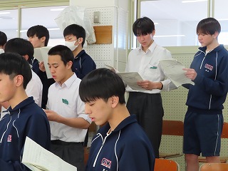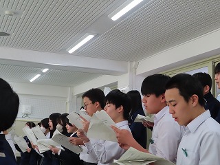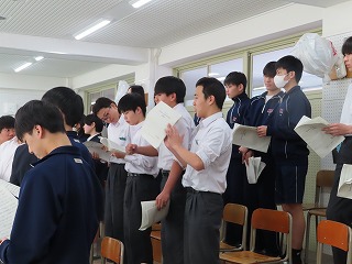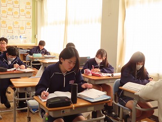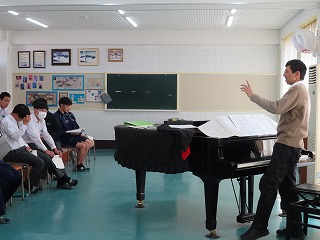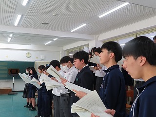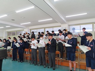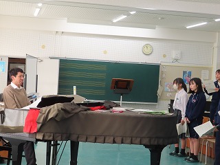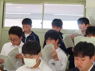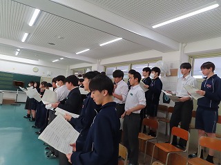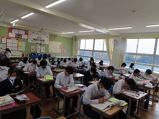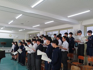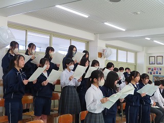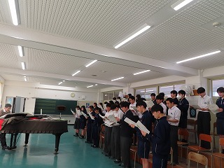 さて、4限目の音楽の授業は、3月6日(金)の卒業式に向けた合唱練習の真っ最中。大池中学校校歌をはじめ、合唱曲を音楽担当の先生のピアノ伴奏に合わせて歌います。まだもう少し、歌詞・楽譜が必要な人もあるので楽譜を見ながらの合唱。でもみんな大きな声で気持ちよさそうに歌ってくれています。どんどん3年1組らしく、息の合った、気持ちを込めた歌声に変わってきました。最後に歌ってくれた合唱には一番の心がそろった響きで感動させてもらいました!