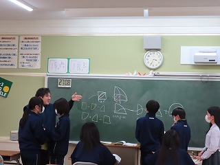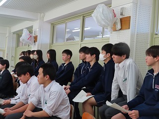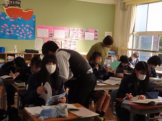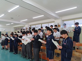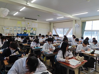 授業の最後には、音楽授業担当の先生からは、「1組の音楽授業もいよいよ次の授業が最後になると思います」との言葉。1組の子どもたちからは、「えええ・・・?」「うそ・・・?」「本当に・・・?」という声があちらこちらで聴こえてきます。でもこれが、3年生の子どもたちの実感なんでしょうね。だって、毎日の大池中学校での学びの場が日常となっているから・・・。