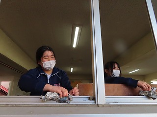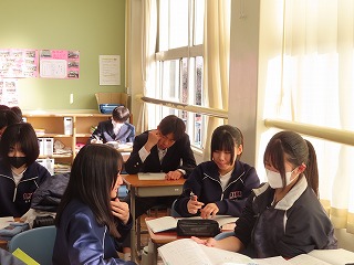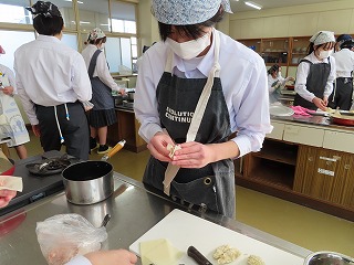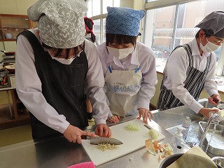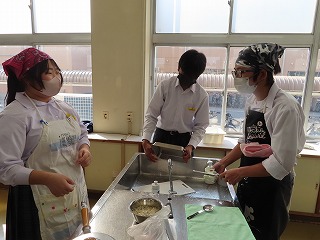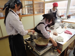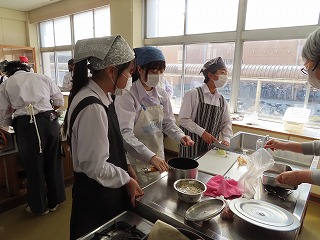 今週2月16日(月)3限目と4限目の調理実習室での授業の様子から。2年3組家庭科の調理実習が始まりました。先週のホームページで紹介したのは2年2組の調理実習の様子でした。しかし、時間の都合で調理がほぼ完成し始めている頃からの参観となったので、今回の2年3組の調理実習は授業開始の3限目から参観させてもらいました。