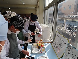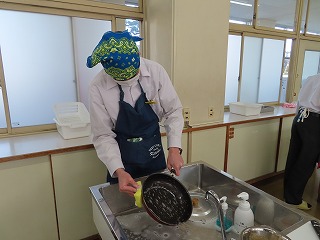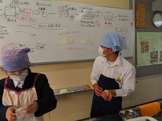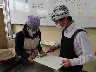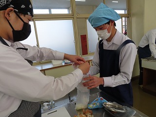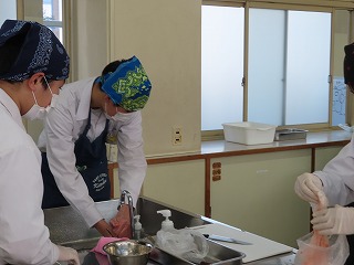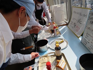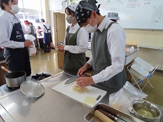 各班ごとで役割分担をしながら仲間同士で声を掛け合いながら調理が進んでいきます。何度も調理手順を確認しながら作業に取り組んでいきます。しかし、まな板の上で、焼売をつくるミンチなどの生ものと、大根を一緒に置いての調理の様子に、授業担当の先生からは「何で生ものと野菜が一緒に置いてるの!考えて取り組んで!」という声がけや、「何で調味料がこぼれたままになってるの!班で考えて!」などという注意を促す声が聞こえてきます。授業の始まりには、班の中でなかなか全体を見ることができなかったりする場面がありましたが、時間とともに協力しながら取り組める良さが見えてきました。