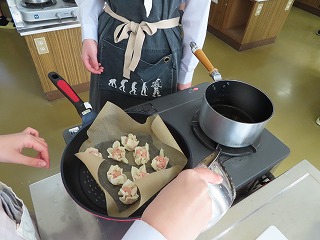 3限目の前半は、教科担当の先生に注意される場面もいっぱいあったのですが、時間とともに後半には、班で協力してどんどん皮で包んだ焼売ができてきたり、大根のはりはり漬けの準備もバッチリな様子がいっぱい見えてきました。フライパンに焼売を乗せて準備万端。大根のはりはり漬けも準備万端。