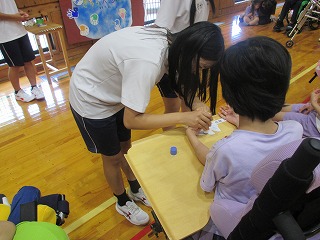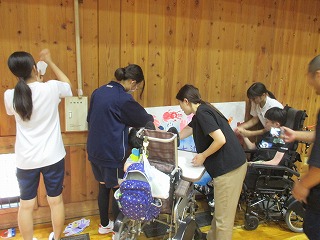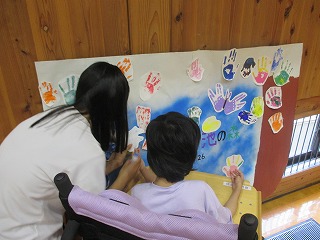 1回目の交流会の活動内容は、お互いの学校に大池中学校と北勢きらら学園の交流活動の証となる、カタチとして残るものをみんなで創ろう!です。事前にお互いの学校間で参加してくれるみなさんの「手形」を作成し、交流会のときに、一緒に貼り付け作業などをどこに貼るのかを考えながら行うものです。きらら学園の子どもたちと、大池中学校の子どもたちが寄り添いながら、一緒に手形を張り付ける様子はみんな嬉しそうです。いっぱいの笑顔で取り組みました。