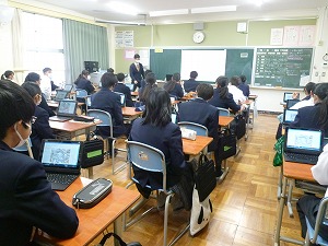午後、1年5組を授業を職員が参観しました。内容は人権学習でした。これまで1年生は福祉(ふくし)など身近な人権に関することを学習してきました。学習では、自分自身の気持ちを周りの人に言葉や文字にして伝えたり、周りの人の思いをしっかりと受け止めて考えるなかで、あらためて自分の気持ちと向き合う姿があったように感じられました。