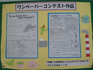 2年生の廊下(ろうか)に、生徒が書いた英文が掲示(けいじ)されていました。伊勢茶と環境にかかわる内容のようです。とても丁寧(ていねい)に書いてありました。
