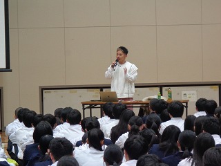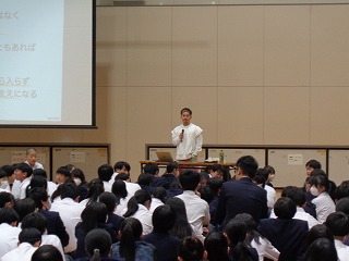 本日12月19日(金)5限目から6限目にかけて「総合的な学習の時間」として、『親子人権講演会』をPTA主催にて開催しました。司会進行をPTA文化教養部 部長の伊藤さんにお願いしました。大変お忙しい中、ありがとうございました。 親子人権講演会とはいえ、一番は大池中学校の子どもたちに本日の講演者である山口颯一さんと出会ってほしい。「出会い学習」として、山口さんとの大切な出会いを通して、生き方に触れ、自分事として考え、学び、知ってほしい。この出会いの時間を大切にし、山口さんに向き合ってほしい。そして性の多様性のあり方について考えるきっかけにしてほしい。 本日の講師は、『 一般社団法人ELLY代表理事 山口 颯一 さん 』です。 講演テーマは、『 性別って2つだけ? 性の多様性のあり方について』 大池中学校の子どもたちとの初めての出会い。子どもちの緊張感を山口さんはどんどんほぐしてくれます。子どもたちは山口さんの問いかけに対して、近くの仲間と相談したりしながらもしっかりと自分の考えを持ちながら話をしっかりと聴くことができました。あたたかい雰囲気をつくっていただきながらも、山口さんの経験からくるご自身を語る言葉ひとつひとつに重みがあり、その考え方や生き方に触れながら、自分事として考えることができる貴重な1時間となりました。 悩み事を持ったときに、相談しやすい環境が整っているか。どうすれば相談しやすい環境になるのかを考えていくことも、今後の子どもたちに伝えてもらった内容だと思います。自分たちの周りにも左利き、血液がAB型の人と同じ割合くらいに当たり前にLGBTQの人がいること。もし、相談されたら、『否定から入るのではなく、チカラになれることがあれば支えになるよ』って寄り添ってあげてほしい。「自分らしく みんな違って当たり前」。だからこそ、『誰もが安心して暮らせる社会になってほしい』。山口さんのお話の中に子どもたちは引き込まれていくように、しっかりと話を聴き、しっかりと考える時間をいただきました。 子どもたちは、LGBTQの基礎知識を学びながらも、多様な性の存在に気づくだけではなく、自分と違う人を認め、共に支え合うことで、誰もが過ごしやすい社会になっていくことを感じとってくれたと思います。講演会の後は、山口さんに3年生の教室すべてを回ってもらい、子どもたちからの質問にも笑顔で丁寧に答えていただきました。講演をいただいた山口さんから、このようなお話、感想をいただきました。 「大池中学校の子どもたちは、みんな本当によく話しを聴いてくれました。こちらからの質問や呼びかけにもみんなが一生懸命に考えてくれて、話し合いで盛り上がっていても、こちらが伝えたいことを話し始めると、全員が切り替えて話を聴いてくれます。ぼくが話している間も、多く子たちがうなずきながら話を聴く姿。本当に嬉しかったです。 大池中学校のみんながすぐに話し合えるあたたかな雰囲気と、話を聴いてくれているときのあたたかな雰囲気と表情が印象的でした。中でも、3年生のすべての教室に行った時にも、学年やクラスのあたたかさをしっかり感じ取ることができました。また、講演会の中では、質問をしてくれる子たちが、素直に一生懸命考えながら質問をしてくれたことも本当に嬉しかったです。」このような感想を伝えていただきました! 山口さんが、初めて出会う大池中学校の皆さんへの印象です。山口さんが感じられたみなさんの姿こそが、大池中学校の強みであり、一番大切にしたい、伸ばしていきたい子どもたちの姿です。 山口さん、本日はありがとうございました。子どもたちにとっても教職員にとっても、素敵な出会いとなりました。感謝いたします! 一番最後に紹介したのは、講師の山口 颯一さんに大池中学校を代表してにいただいた大切な『レインボーフラッグ』です。レインボーフラッグとは、LGBTQ₊の尊厳と連帯、社会運動のシンボル。1978年にサンフランシスコのアーティストであるギルバート・ベイカーさんがデザインし、「Gay Freedom Day Parade」で使用されたものが始まりと言われています。性のあり方は多様で、グラデーションとなっているため、美しい虹の色で表現されています。6色のレインボーフラッグはLGBTQ₊を象徴する旗なのです。準備がそろい次第、大池中学校でも、全校生徒の目に届くところに紹介したいと思います。