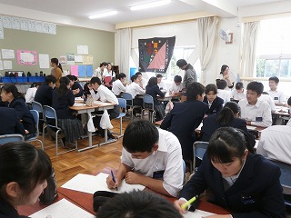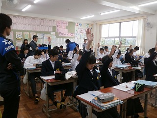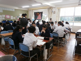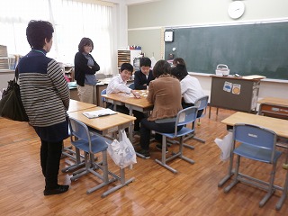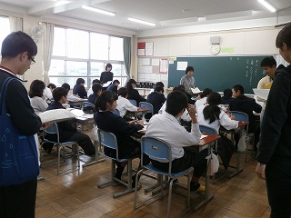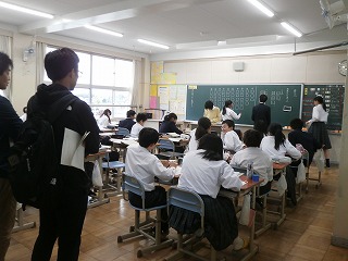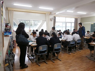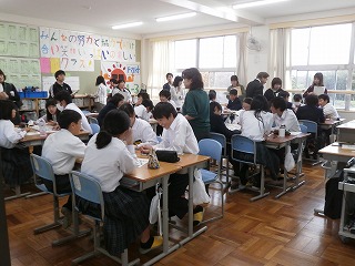 本日(11月13日・火)、5限目に校区の三重・坂部幼稚園、あがた保育園、三重小学校、三重北小学校、県小学校から先生方が、授業を見に来ていただきました。