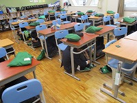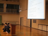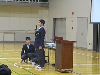始業式前には「避難訓練(雨天のため、体育館へ避難)」が行われました。また、昨年の夏季休業中に「学校防災ボランティア」で福島県・宮城県を訪問した生徒による発表もおこなれました。
