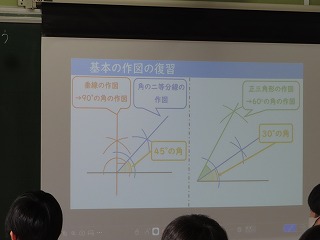 子どもたちは、これまで学んできた作図方法を複数組わせることにより、『垂線の作図にいよって得られる「90度の角」』や『正三角形の作図によって得られる「60度の角」』以外にもつくることができる大きさの角を意見を出し合いながら、どんどん見つけ出していきました。答えは1つだけではなく、多様な考え方で1つの大きさの角をつくる方法を班の中で考え方の交流を深めることができました。