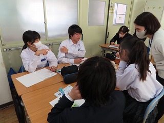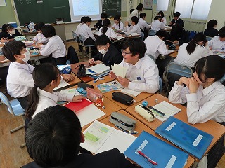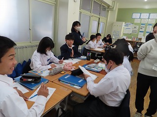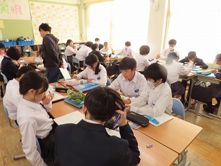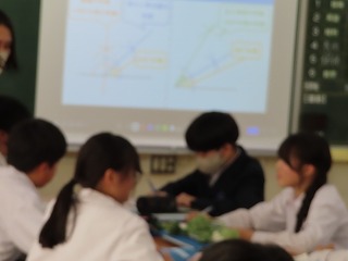 週が明けた本日1月19日(月)の5限目、1年4組の数学授業の様子から。先週の1月14日(水)HPでも1年2組の数学授業、国語授業の様子を紹介しました。本日の数学授業も本校の教職員授業研修に位置付けている「小グループで授業研修」として、4組担任に授業実践(提案授業)を行ってもらいました。教職員間での小グループ研修テーマは『学び合いのある授業づくり ~深い学び・多様な考え方を育成する言語活動~』です。