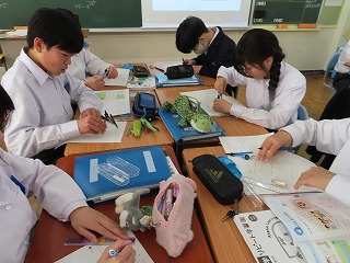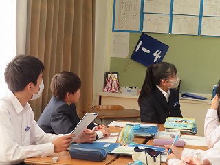 本日の数学授業の「めあて」は『2つ以上の作図を組み合わせて、いろいろな角をつくる方法を考えよう』です。作図を中心に授業がすすむのではなく、今日の授業においては、「めあて」のように、いろんな角をつくる方法を班で学び合いを大切にした授業を展開してもらいました。特に、教職員研修小グループのサブタイトルでもある「多様な考え方を育成する言語活動」を数学の授業においても取り入れながら、子どもたちが班の中で、考えや意見を出し合う場面が多く見られました。
