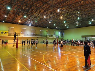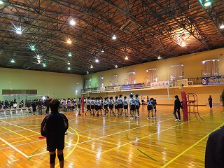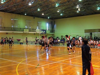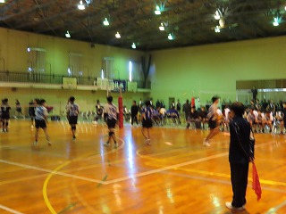 第1試合は8時40分からはじまりました。対戦相手は桑名市を拠点とする地域クラブチームの「桑名セブン」です。第1セットはまだまだ身体と気持ちにかたさが見られ、相手のペースで1セット目を奪われてしまいました。しかし第2セット・第3セットと持ち前の攻撃力で相手チームにペースを持っていかられない、安定した強さを発揮してくれました。最終結果は2-1で勝ち上がりました。自分たちのペースをつかむと、勢いが出て大池中学校らしい攻撃力があり、粘り強いバレーボールが継続されます。その時は、交代してコートに入る選手が、レシーブをはじめ、サービスでもしっかりとチームに貢献してくれました。しかし、第1セットのように、チームがミスを続けたりなかなかリズムに乗れないときに、チーム全体で元気よく盛り返すことに時間がかかってしまうことも課題として残ったと思います。