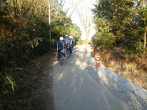 東門手前の道路側溝(そっこう)工事もずいぶん進んでいます。以前より道幅(みちはば)は広くなりました。ただ、広くなっても並進(へいしん)はできません。写真のように左側を一列で、車間距離(しゃかんきょり)をとって走りましょう。特に下り坂では、スピードの出しすぎにも注意して。