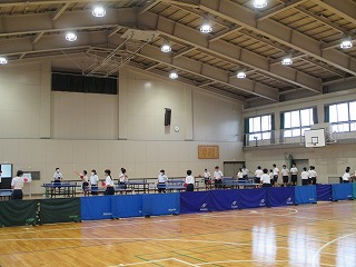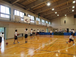 今日は雨。外の部活は屋内のあちらこちらでトレーニングをしていました。写真は、体育館での、バスケットボール部と卓球部の練習の様子です。