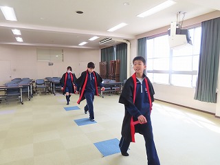 本日2月12日(木)の2限目。校舎北館3階の視聴覚教室からは、軽快なダンス曲と鳴子(なるこ)の音が聞こえてきます。8組の子どもたちが、明日2月13日(金)の午前中に開催される「第39回 三泗小・中学校特別支援学級学習発表会」に向けて、仕上げの練習を、担任の先生と一緒に集中して取り組んでいました。この2限目は、交流学級の授業参加している子どもたちもいることから、写真では4人での活動になっていることを申し添えます。