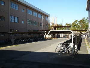 自転車置き場のようすは、始業(しぎょう)チャイム直前(ちょくぜん)に生徒昇降口(せいとしょうこうぐち)から写(うつ)したものです。