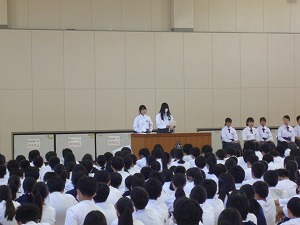 さて、今日は生徒会本部役員(せいとかいほんぶやくいん)の立会演説会(たちあいえんぜつかい)がありました。各候補者(かくこうほしゃ)から、よりよい学校づくりに向けての思いが述(の)べられました。緊張(きんちょう)もしたと思いますが、しっかりと話していた姿が印象的(いんしょうてき)でした。