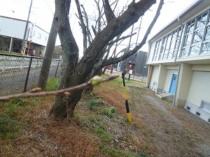 本校武道場横には桜の木が何本か植(う)えられています。現在は上の写真のように小さなツボミの状況(じょうきょう)です。開花(かいか)には、もうしばらく時間がかかりそうです。