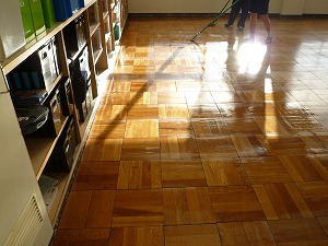 教室のワックスがけも行いました。さしこむ西日(にしび)が反射(はんしゃ)していました。