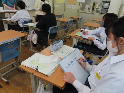 個人のノートやプリント教材はもちろんのこと、8組の英語授業で大切にしているのは、1人1枚の小型の「ホワイトボード」に書き込むことです。大きな英文を書き込めること。間違っていてもすぐに消すことができて、何度もすぐに書き直しができること。お互いの書き込んだ内容を仲間と確認できること。様々な授業内での工夫をしながらわかりやすい授業づくりをすすめてくれています。