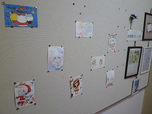 美術部の作品が掲示(けいじ)されている掲示板ですが、クリスマスバージョンになっていました。優(やさ)しい感じの絵が飾(かざ)られています。