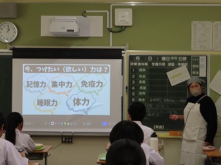 (3年1組2組)30日 栄養教諭の給食時の食育講座。美...