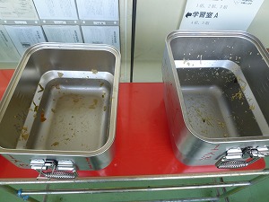 このクラスでは、食缶(しょっかん)の中身がきれいになくなっていました。食の大切さを感じながら、家庭でも学校でも食事をしていきましょう。